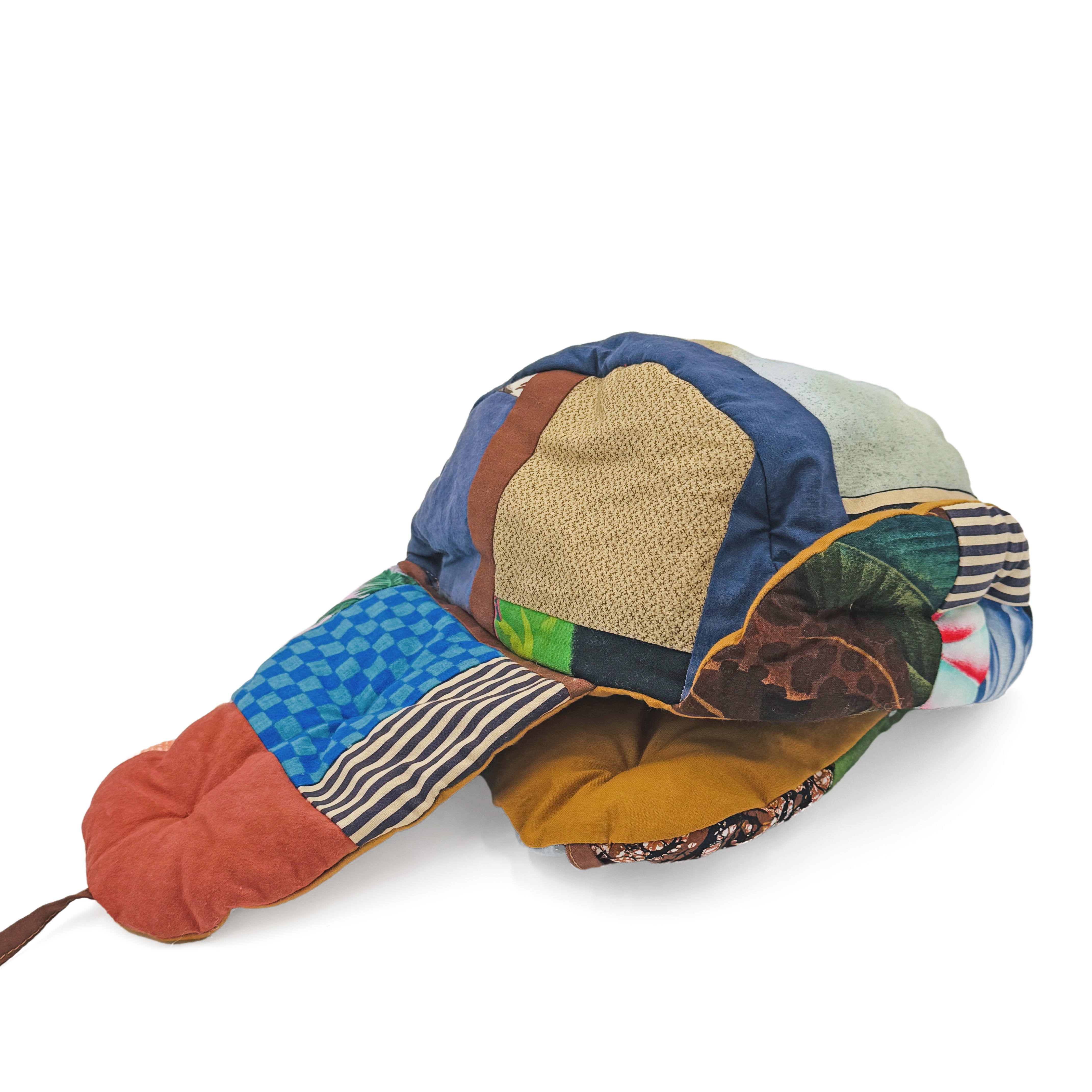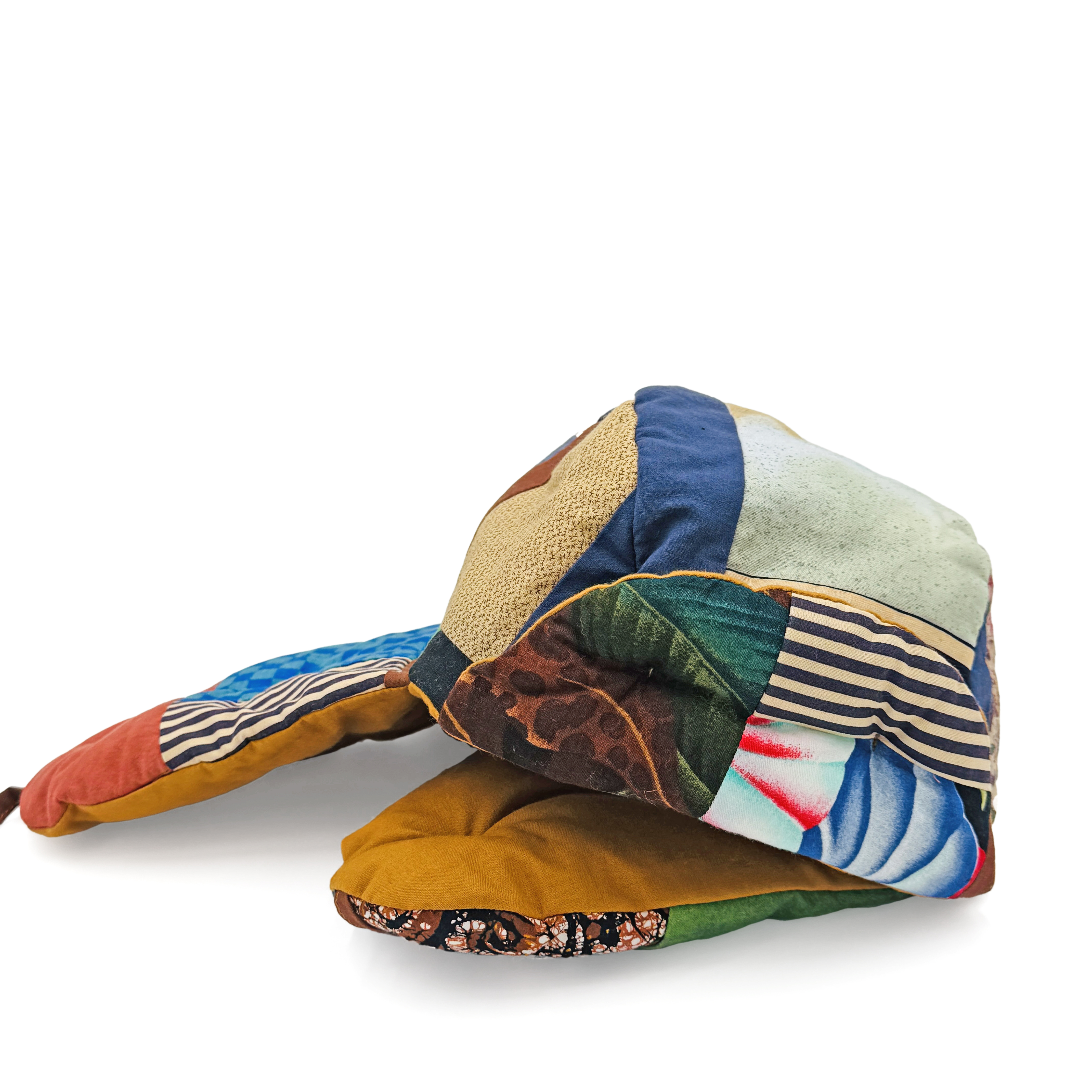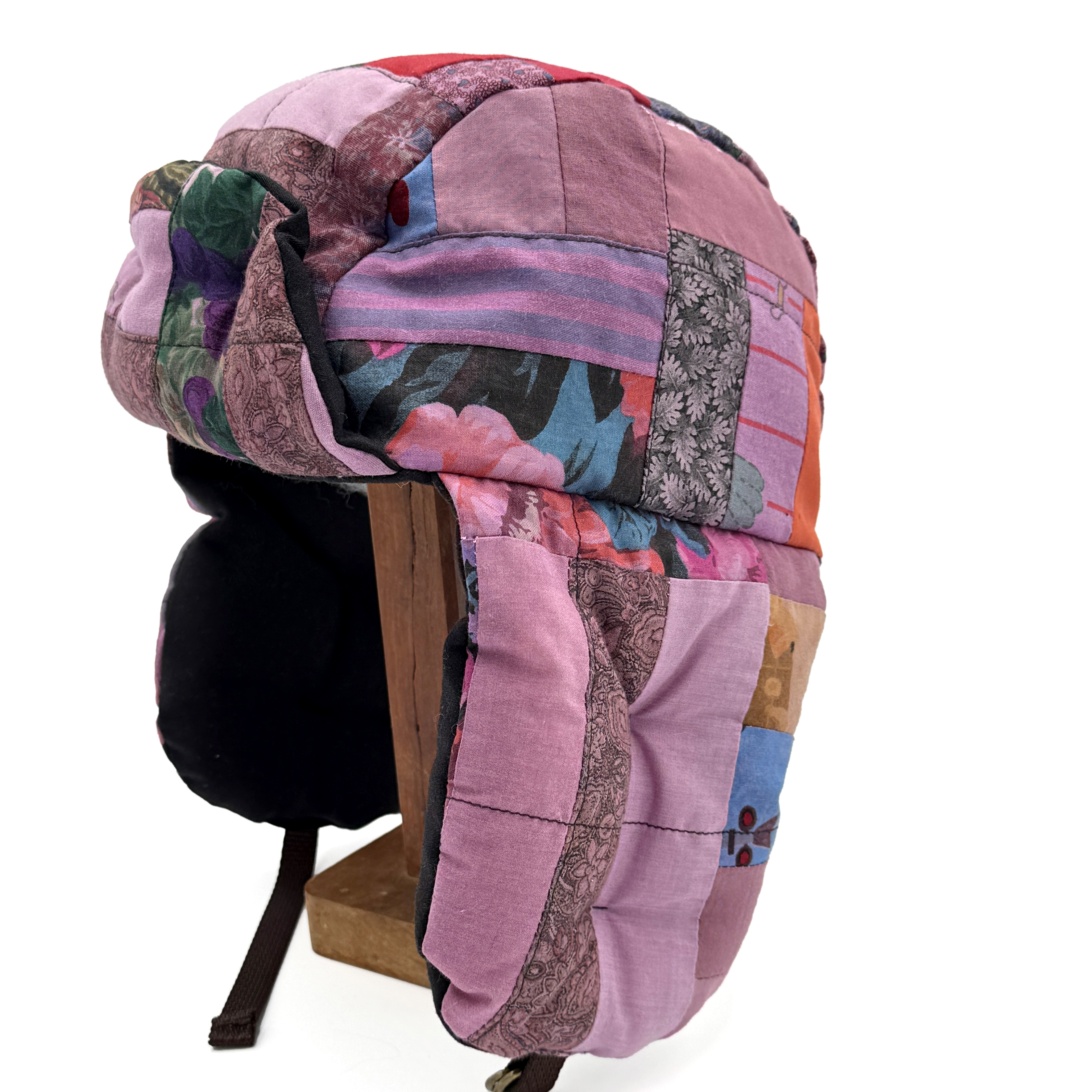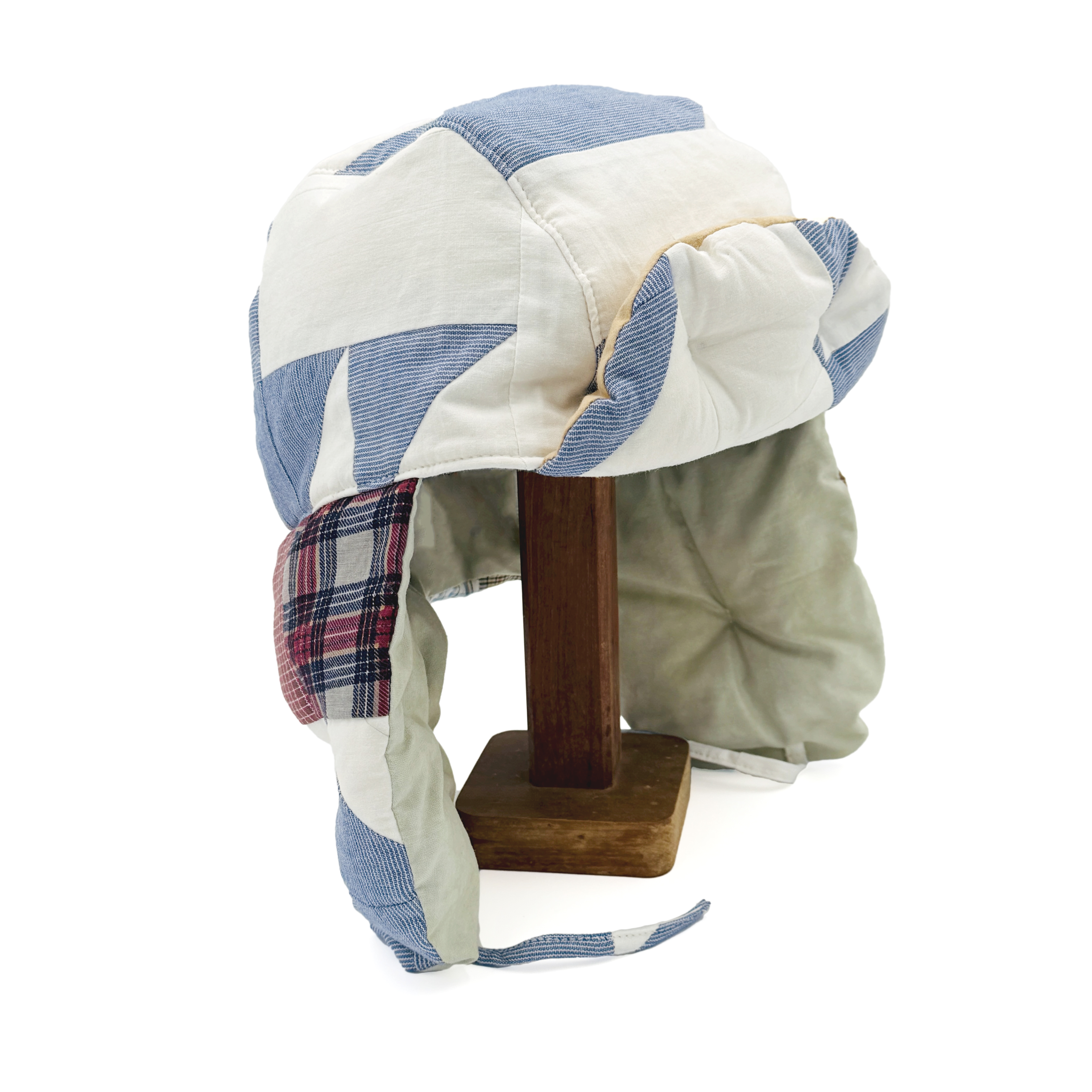 Pieced found and donated textiles with cotton batting and thin ear flap ties.