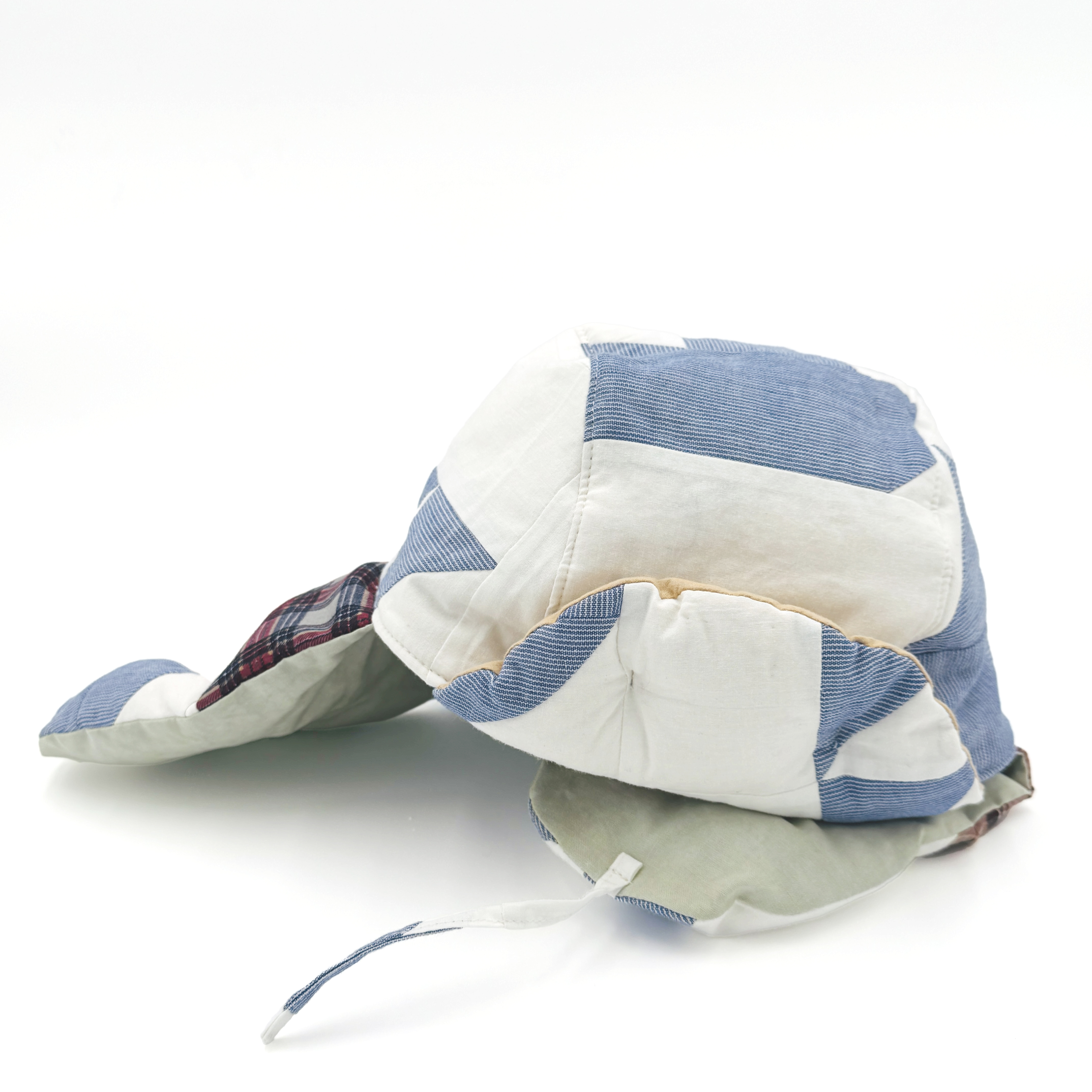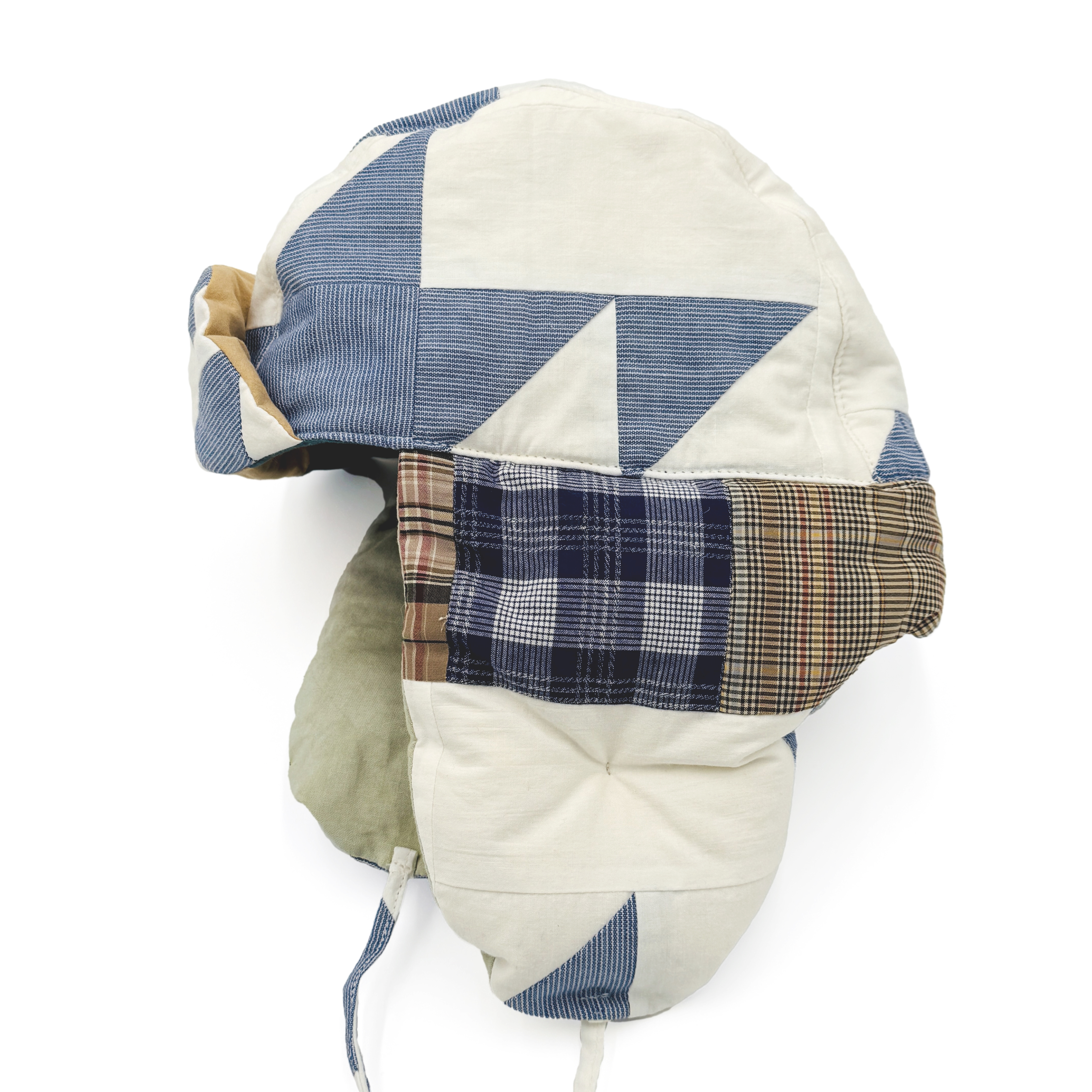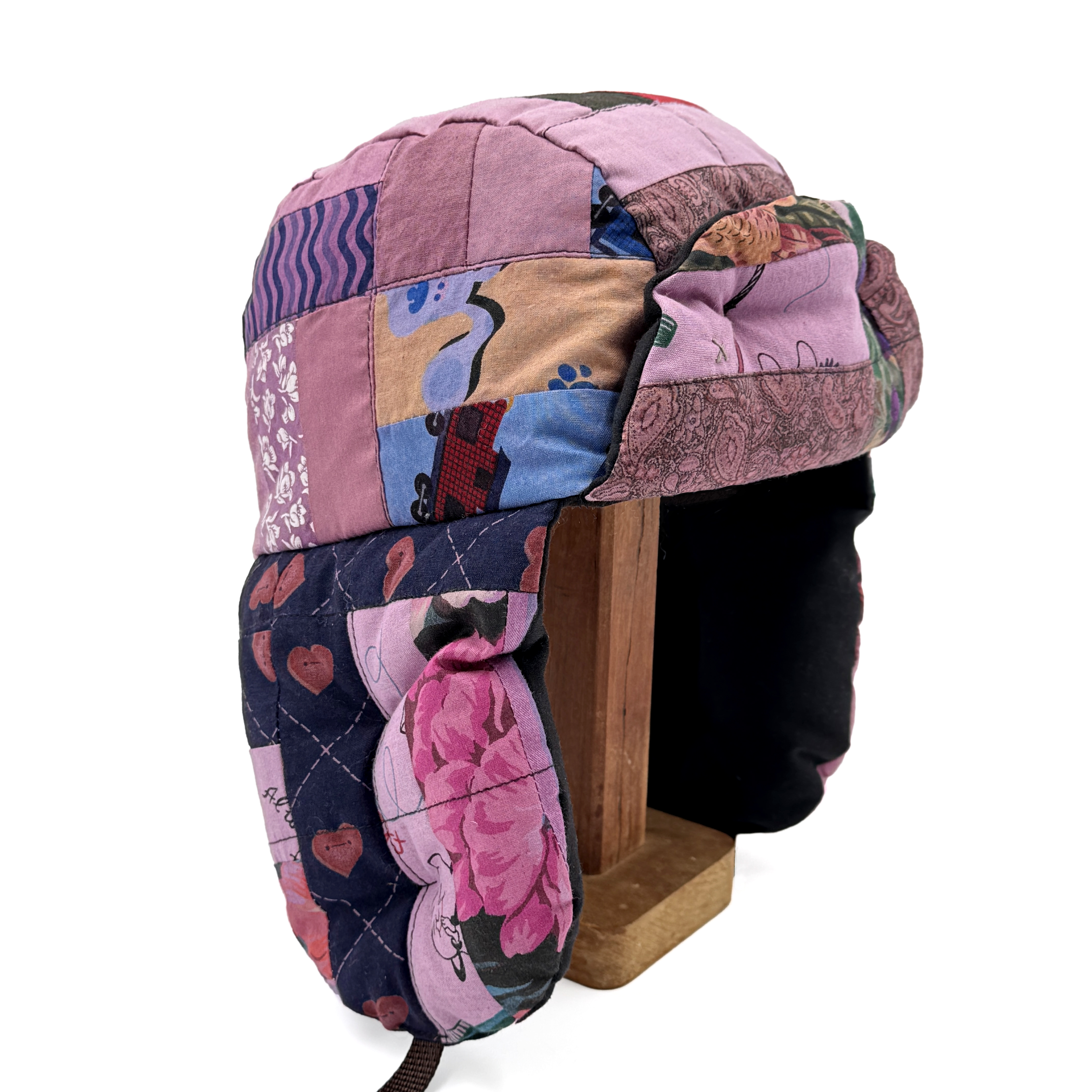 Pieced found and donated textiles with cotton batting and thin ear flap ties.