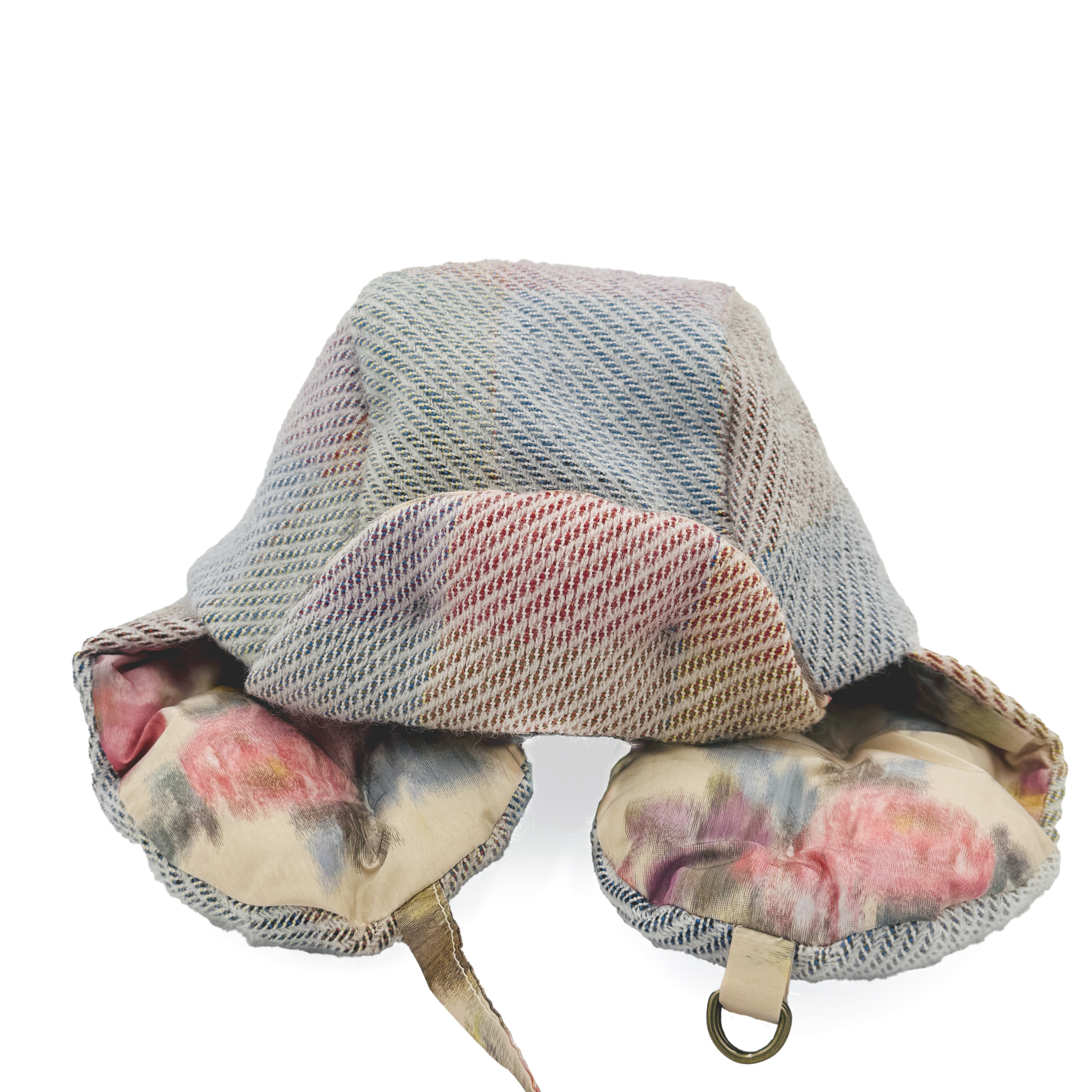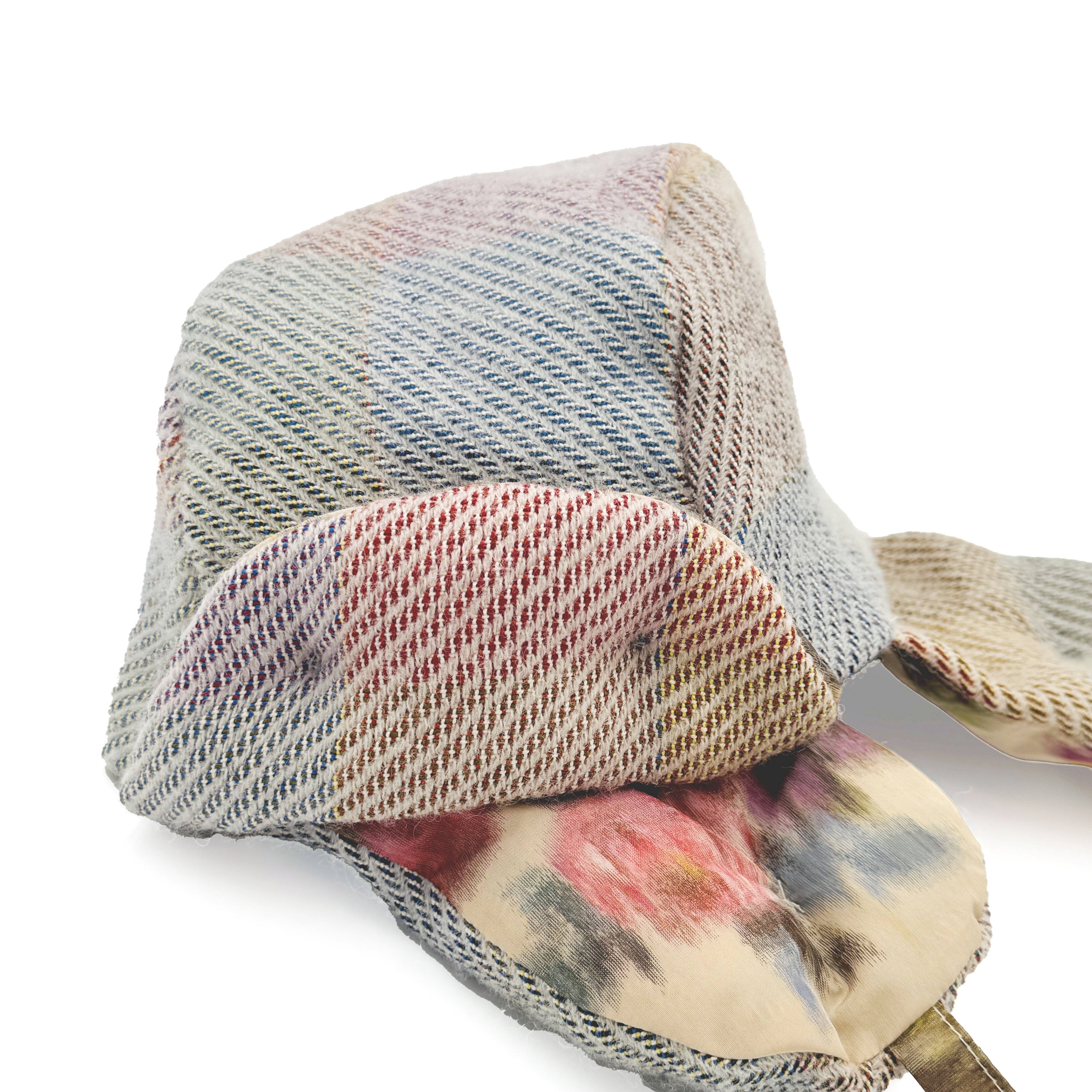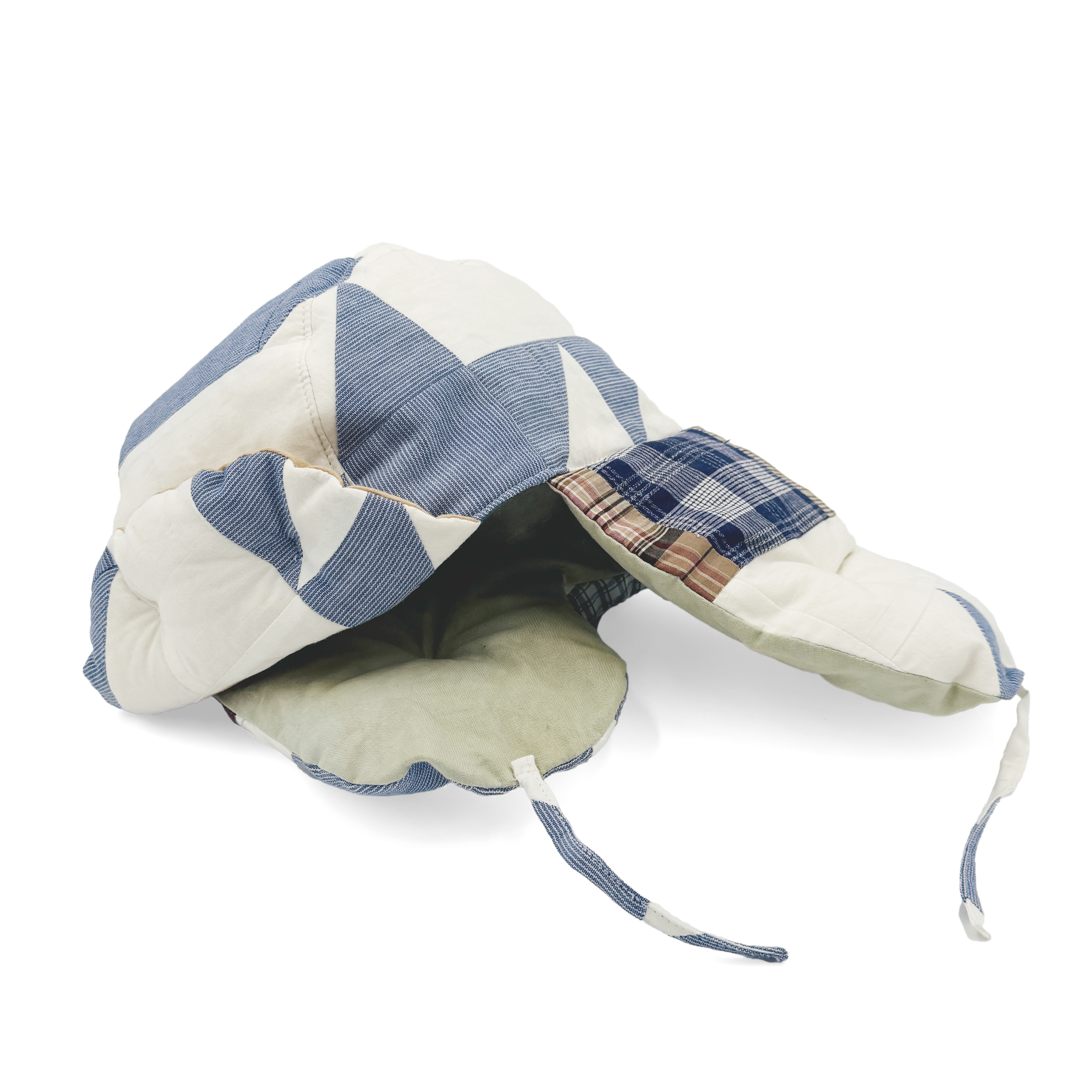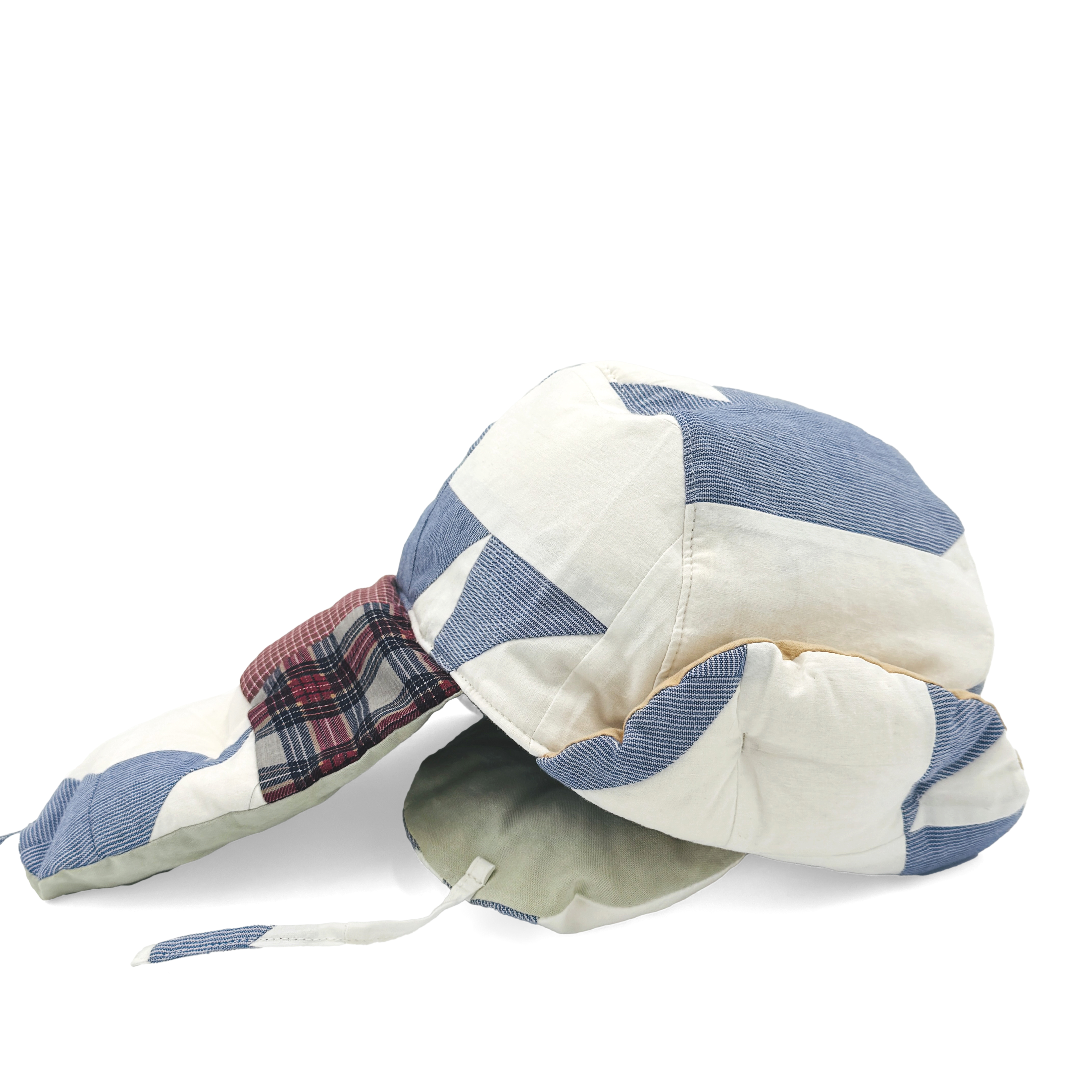 Pieced found and donated textiles with cotton batting and thin ear flap ties.