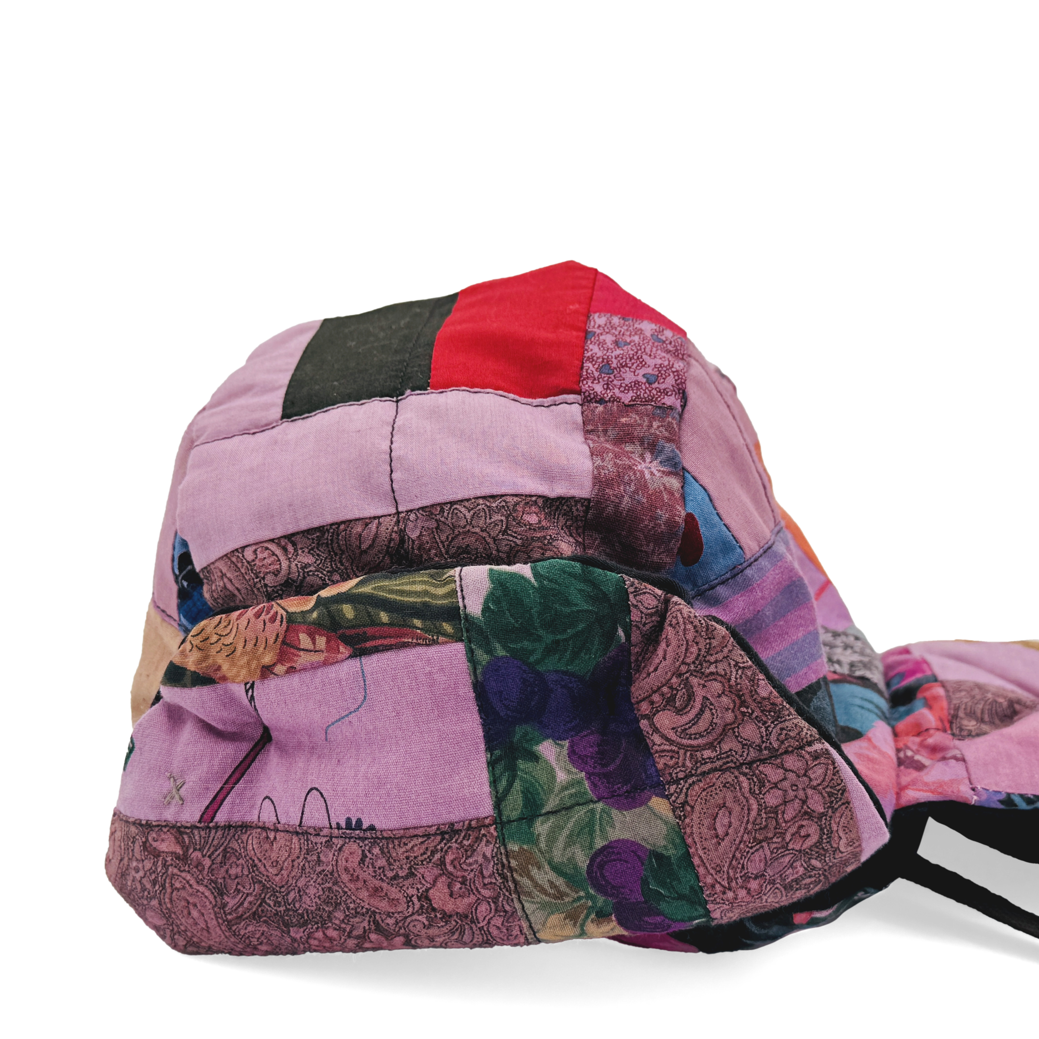 Upcycled nylon shell and brim with pieced front panel and brim and cotton lining.  Adjustable vinyl d-ring strap.  Wash cold and air dry flat.