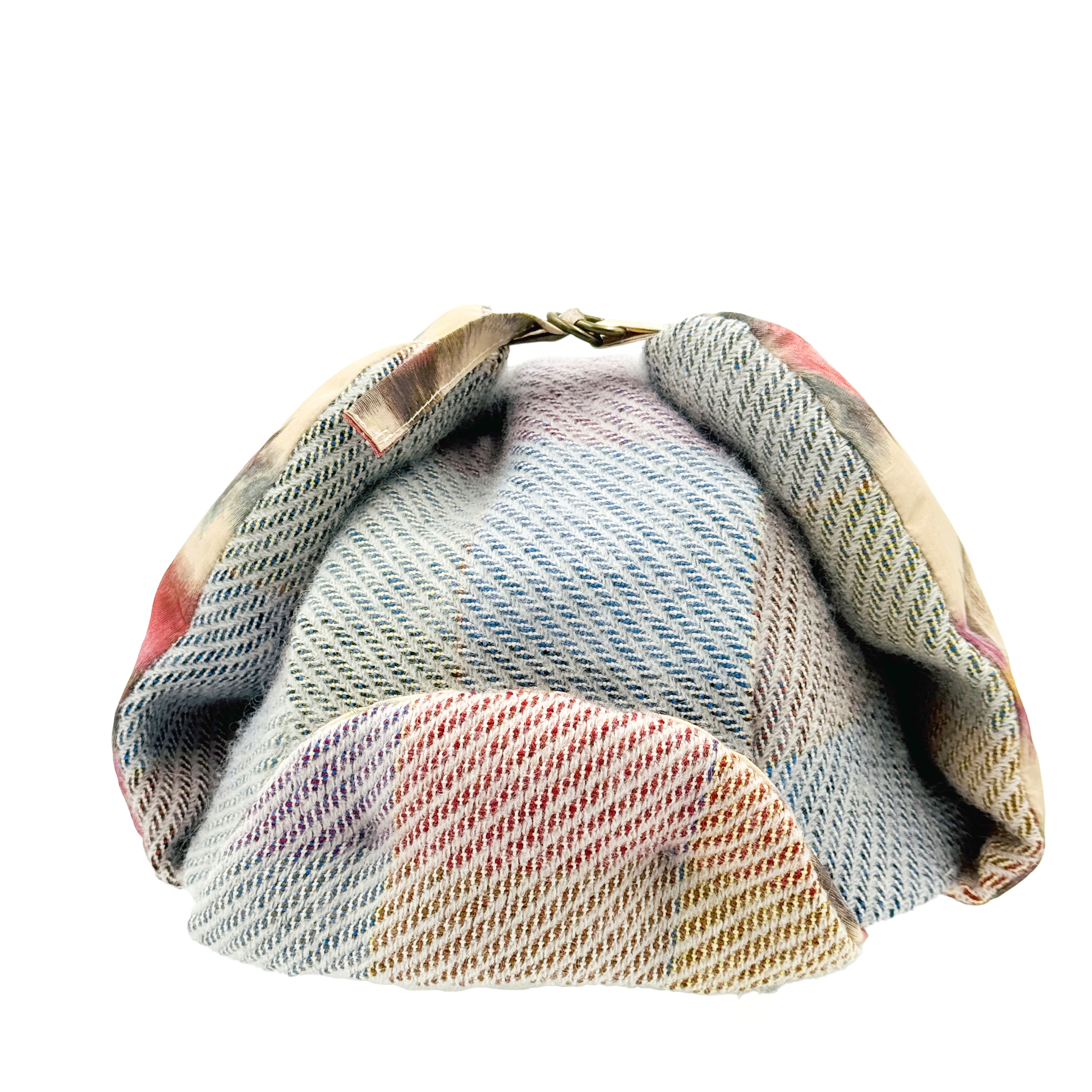 Plaid crown and brim lined with printed kimono lady cotton.  Prewashed.  Completely lined with adjustable vinyl strap and d-rings.  Wash cold and air dry flat.