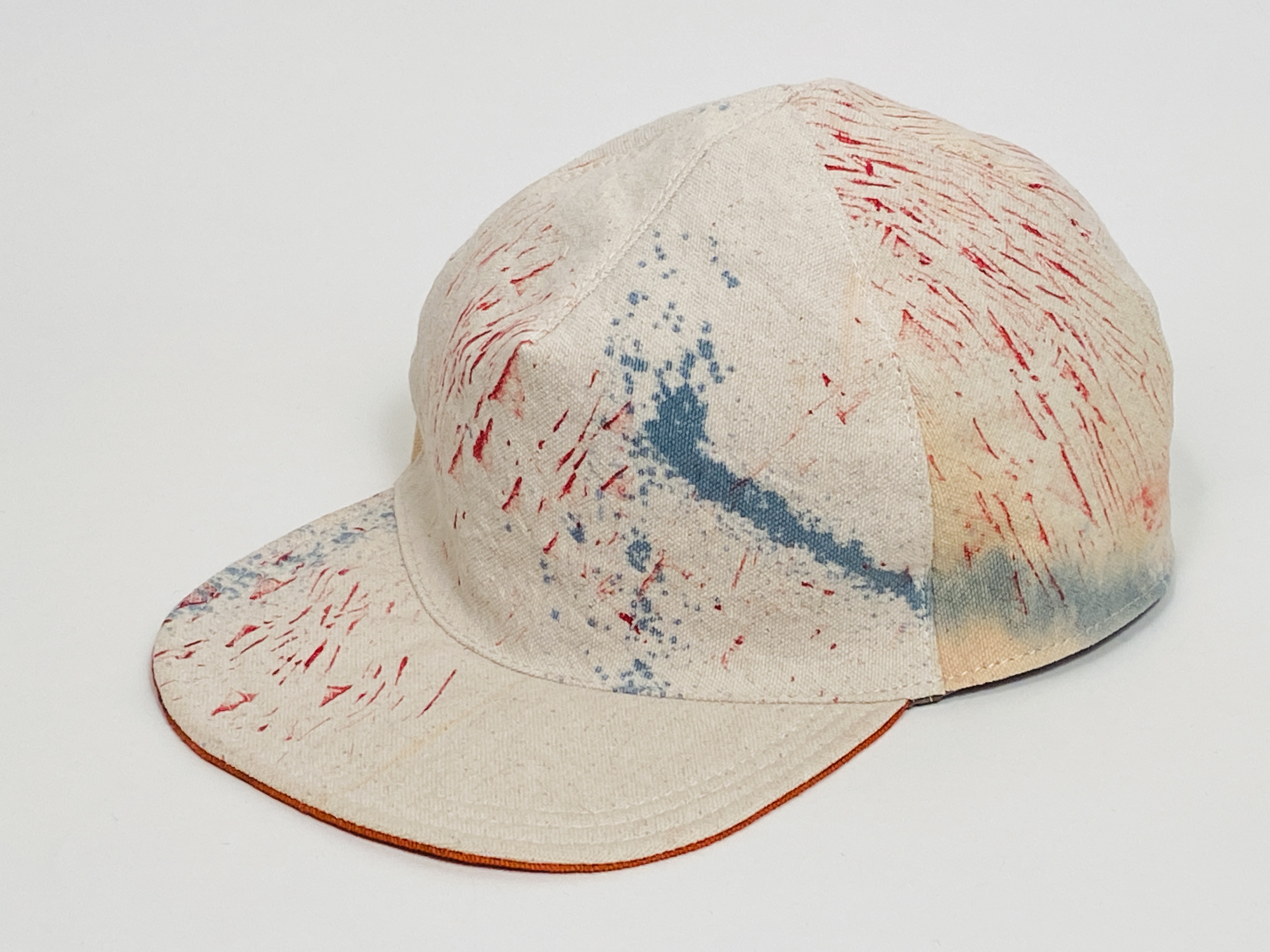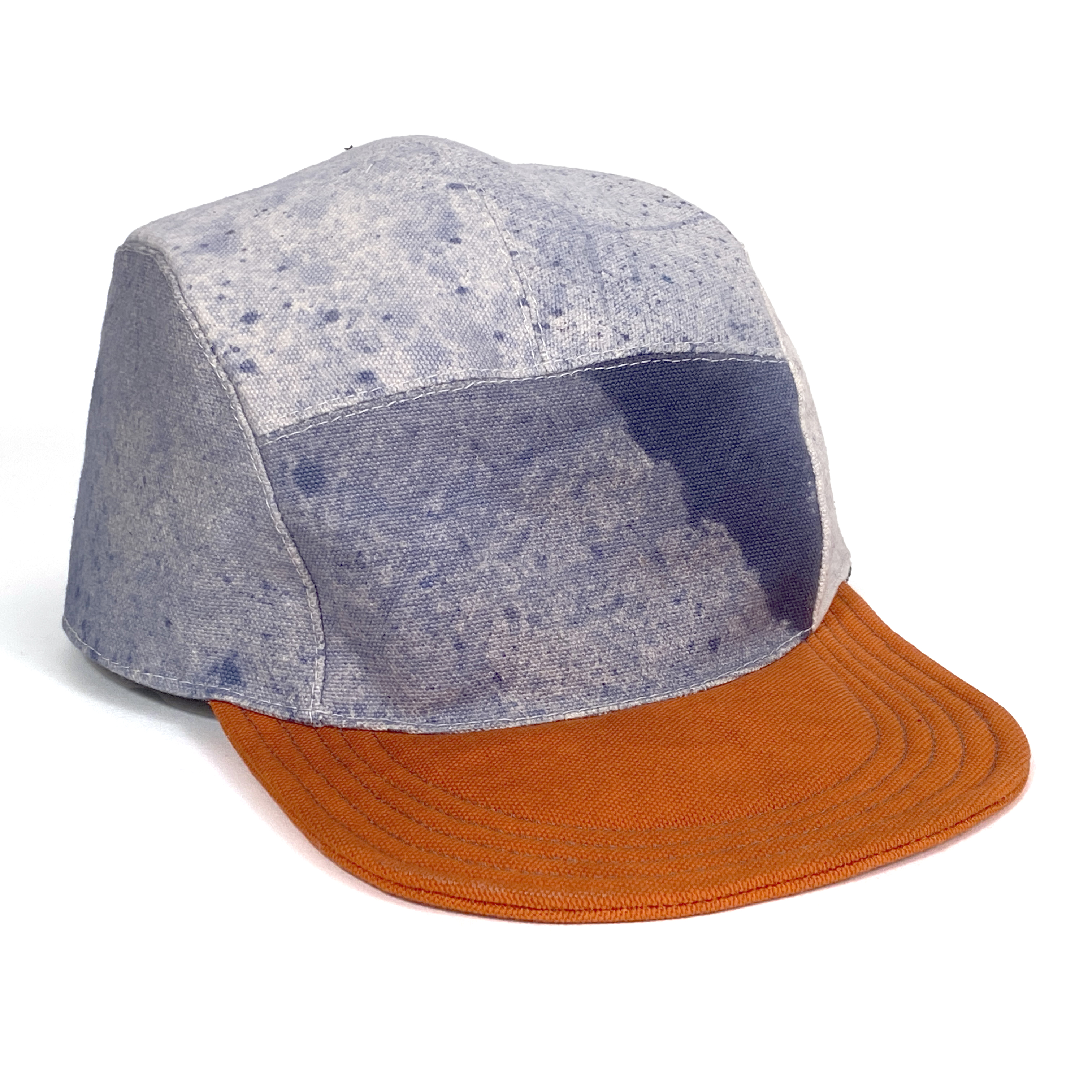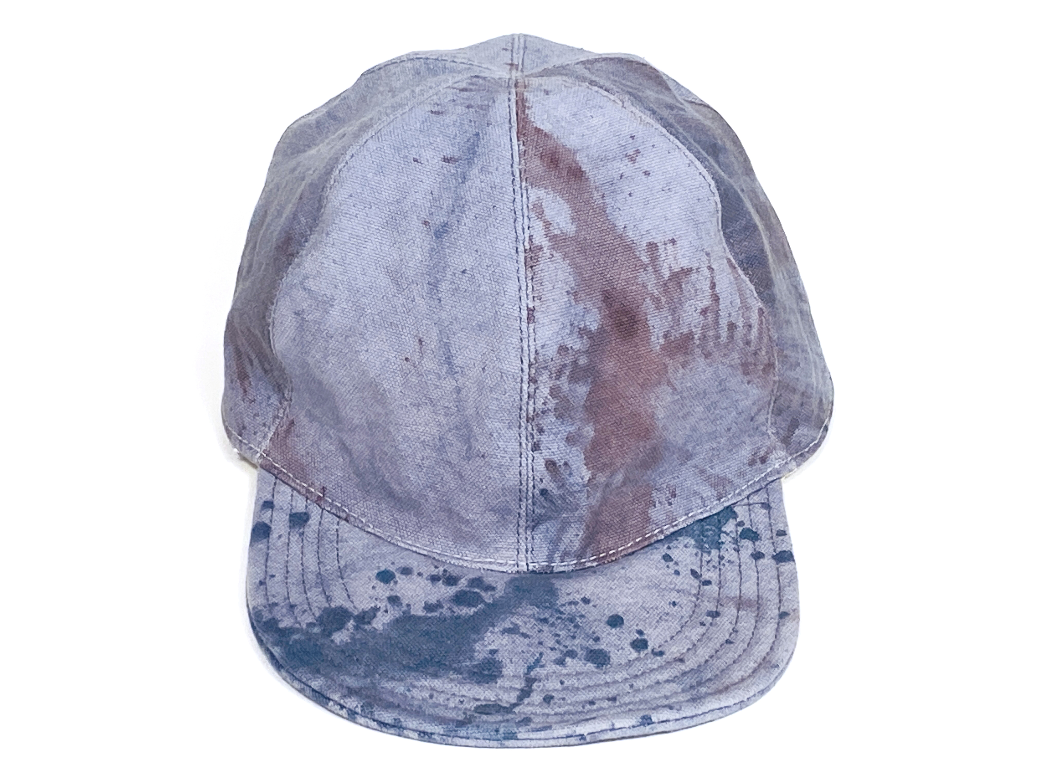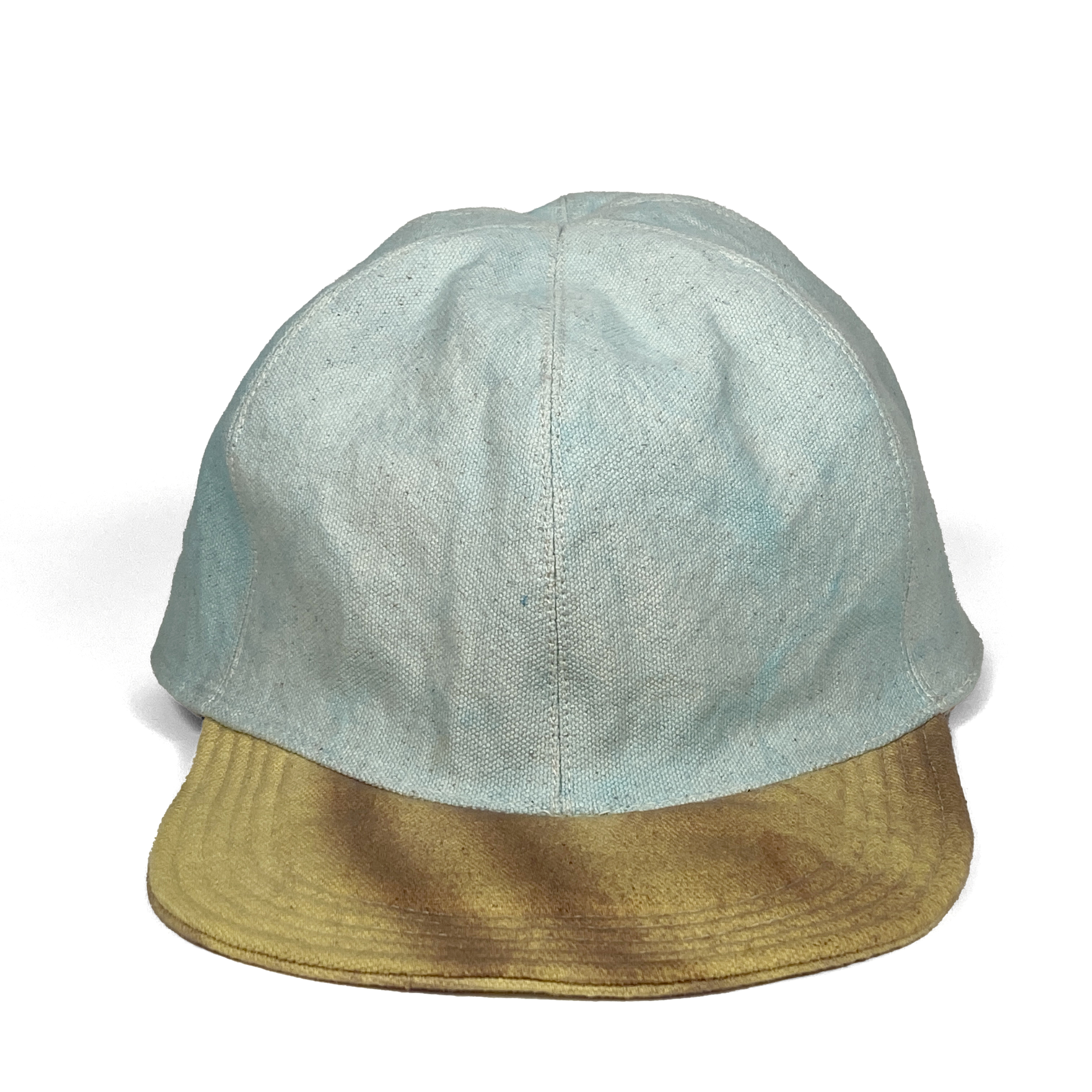 One of a kind dyed canvas crown and brim. Fully lined in thin cotton with adjustable vinyl d-ring strap. Wash cold and air dry flat.
