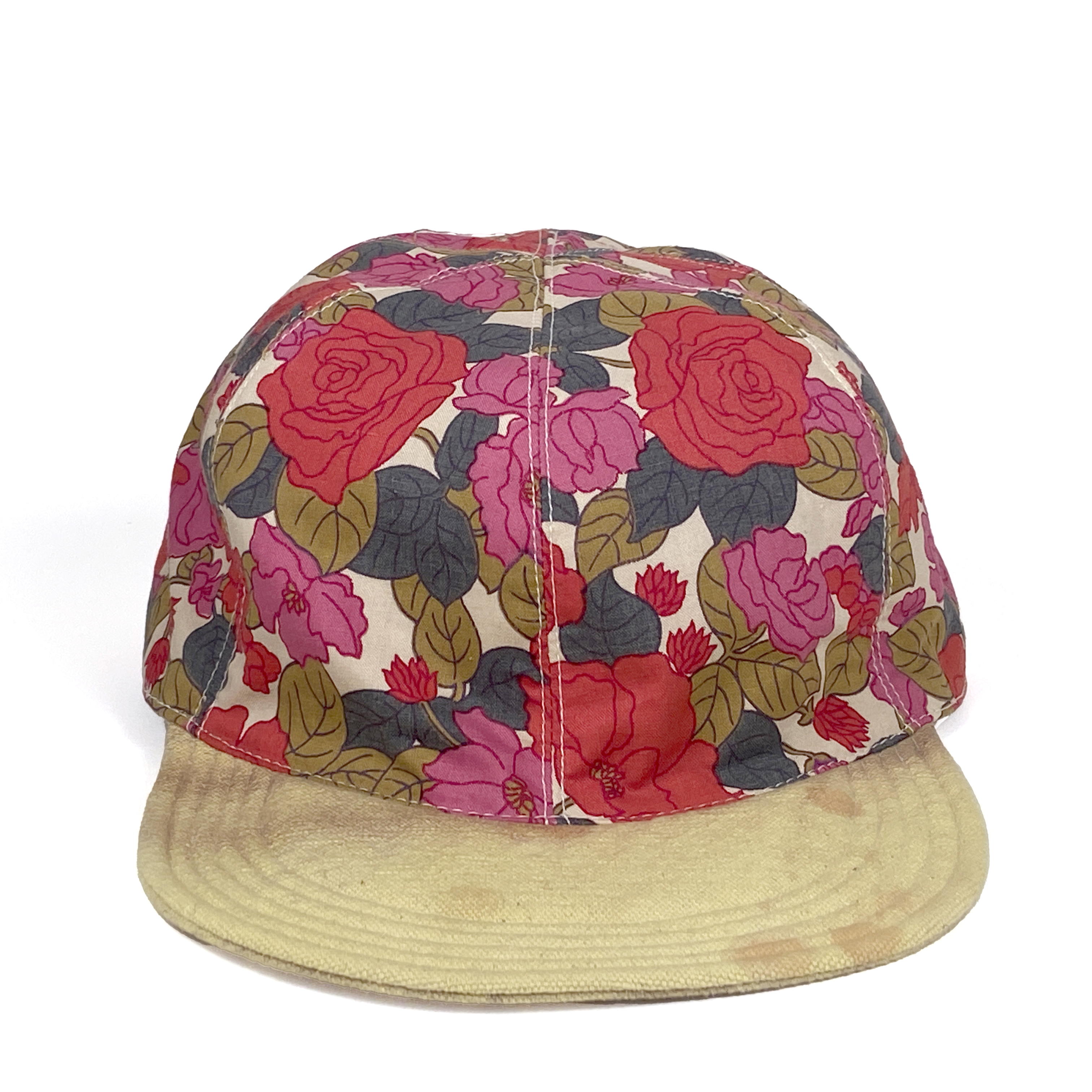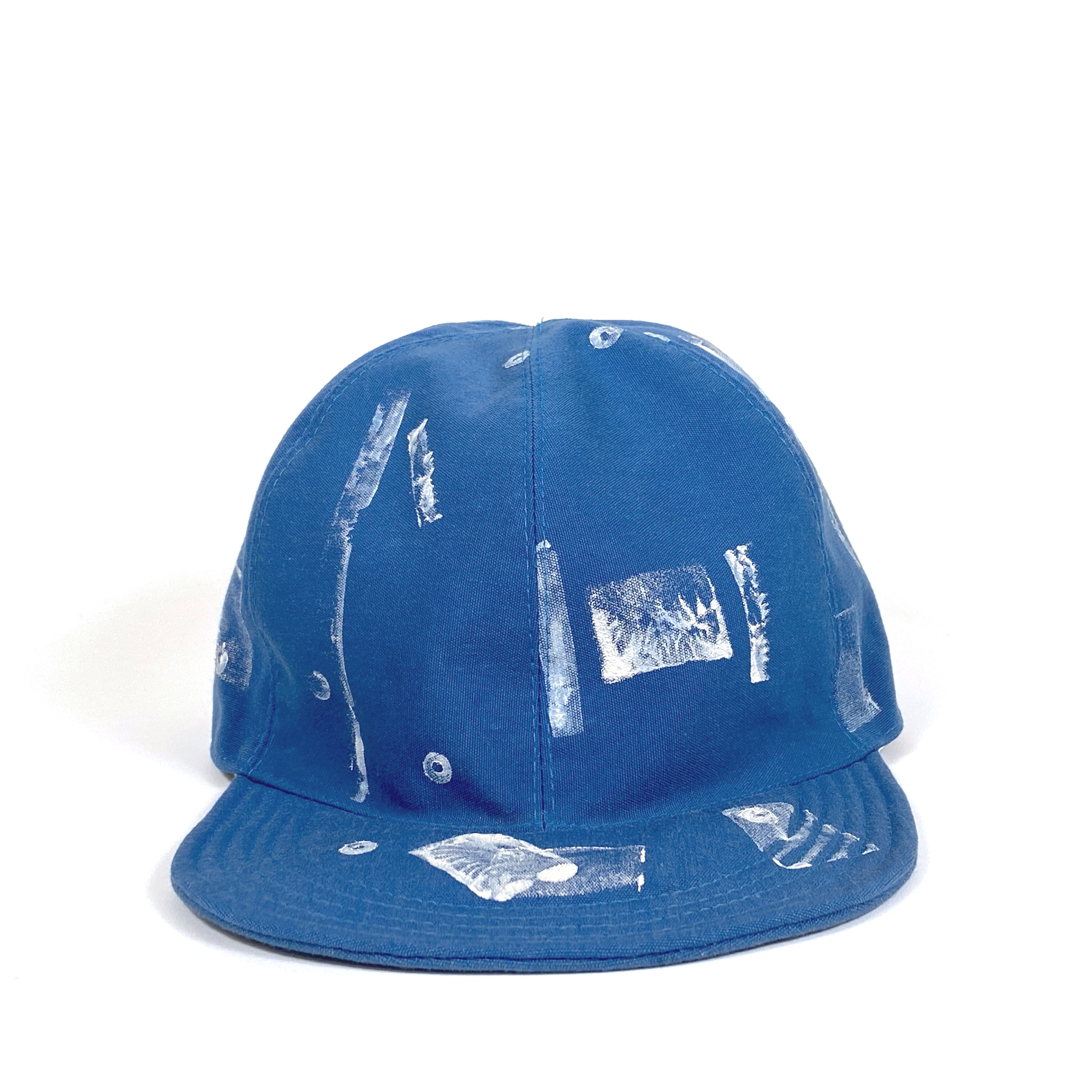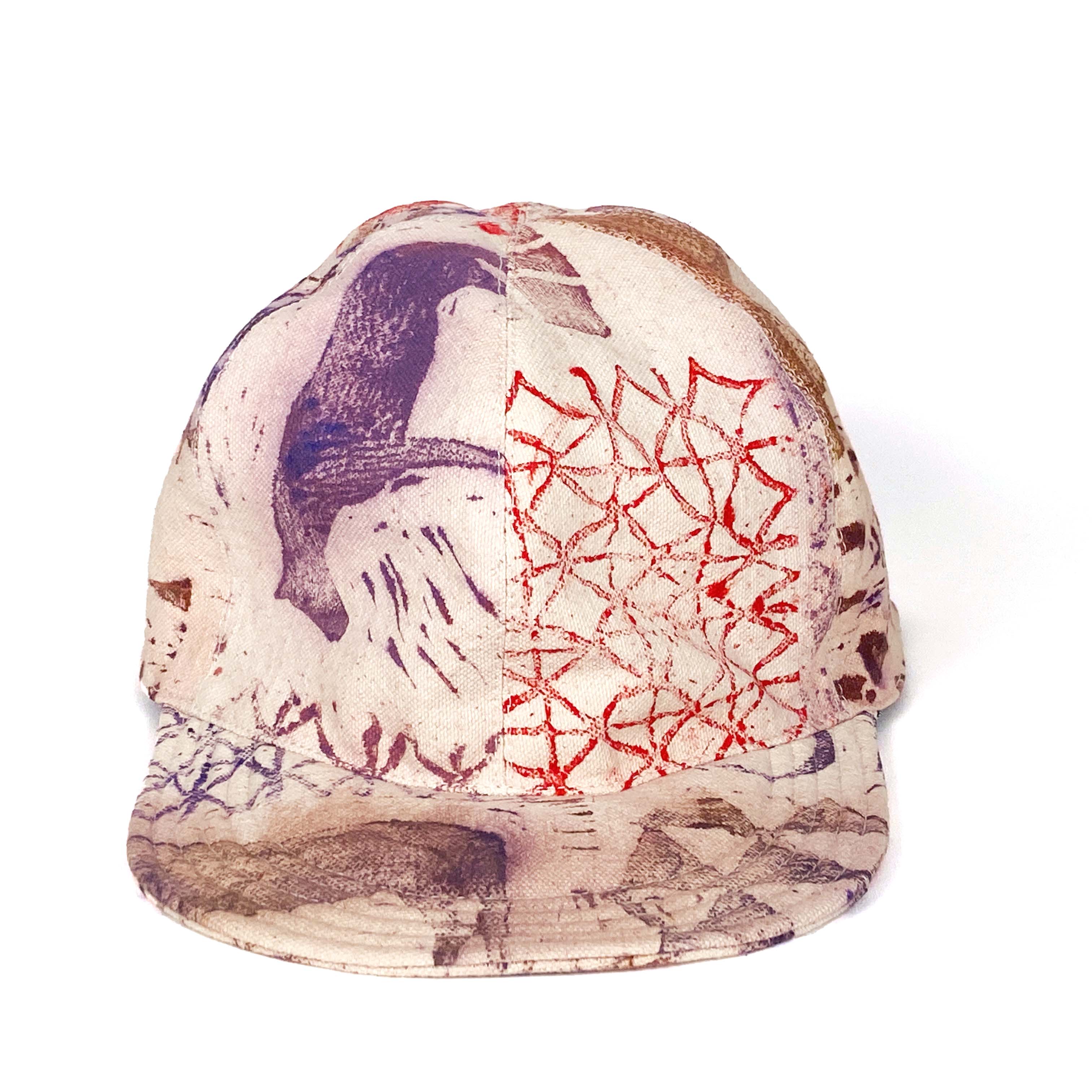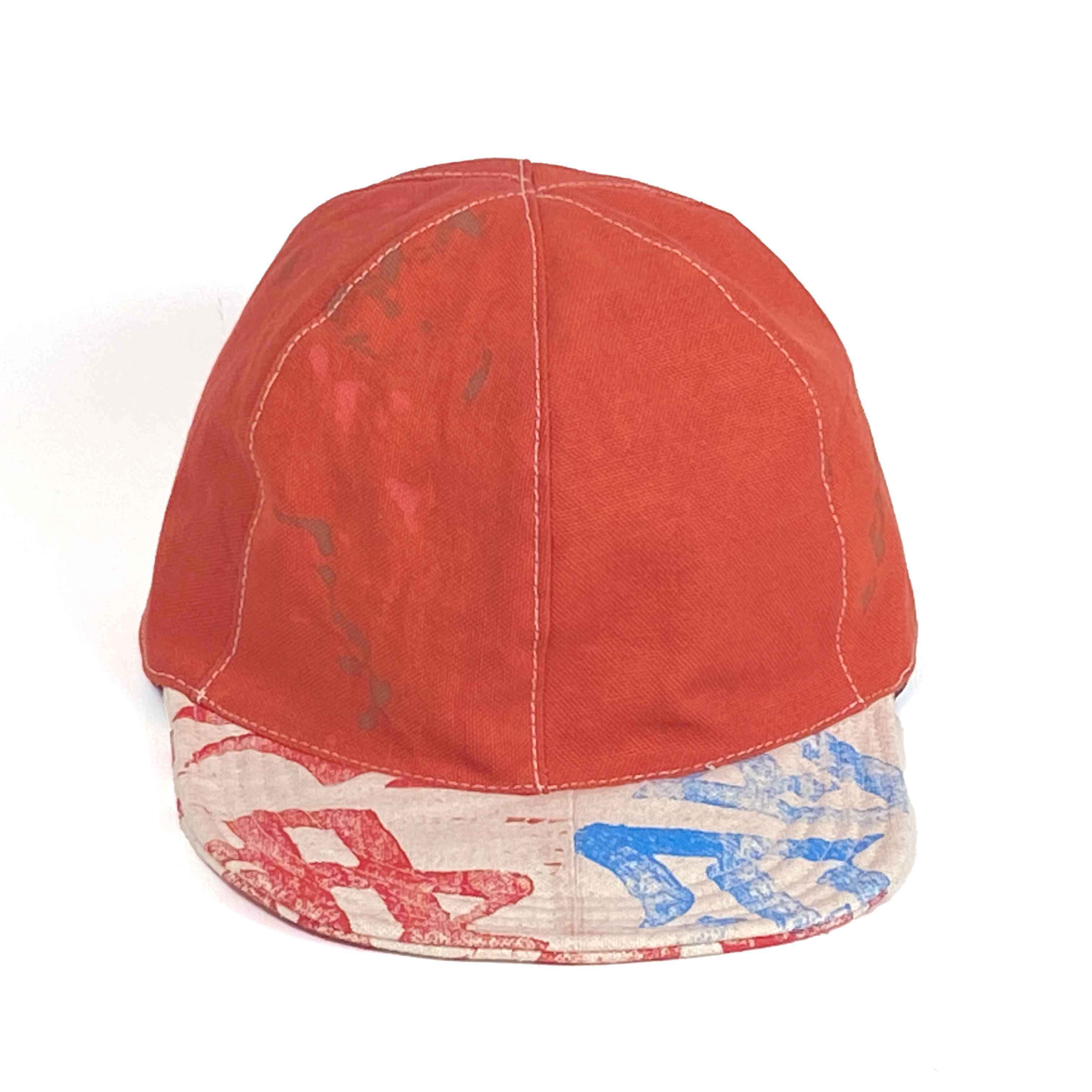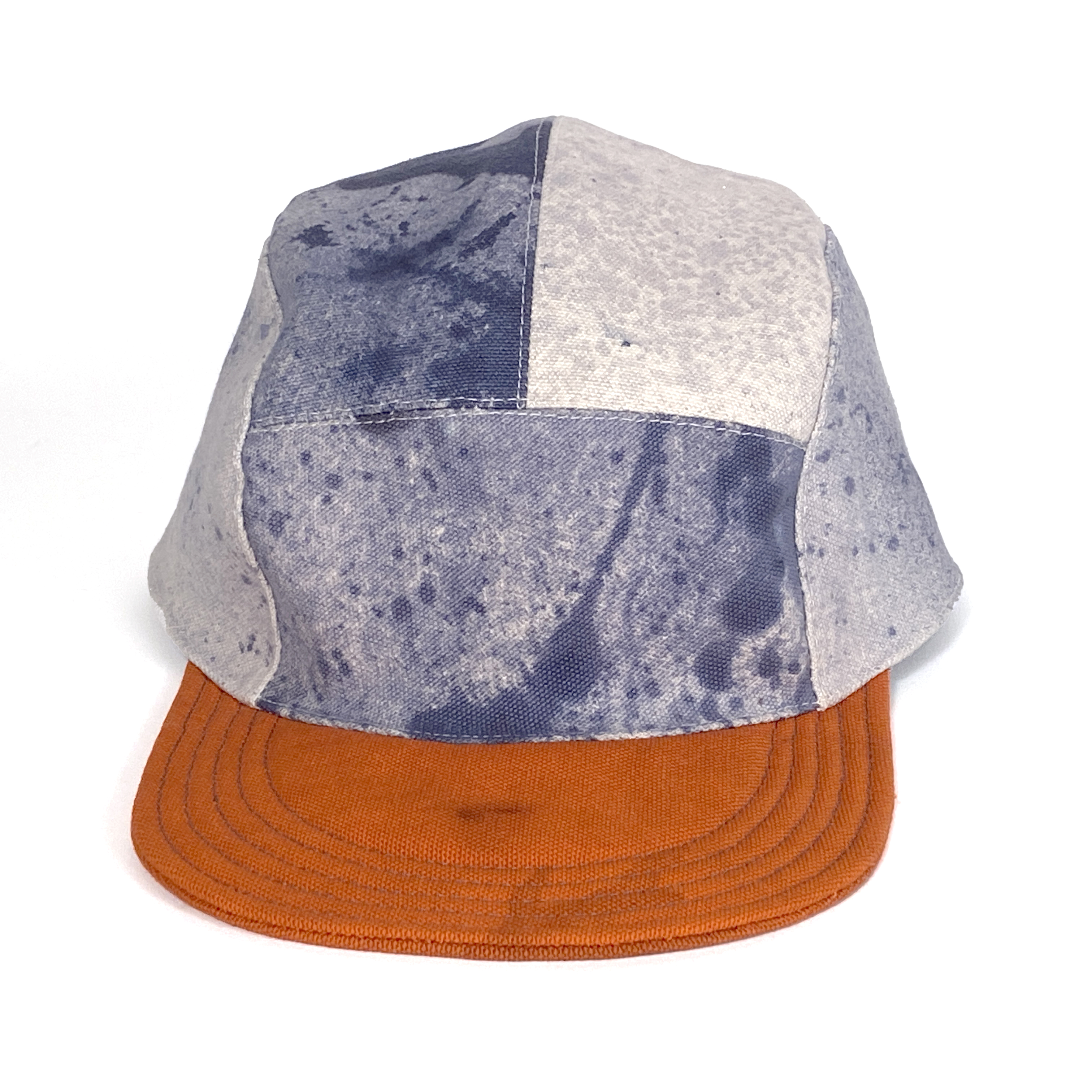 One of a kind dyed canvas crown and brim. Fully lined in thin cotton with adjustable vinyl d-ring strap. Wash cold and air dry flat.
