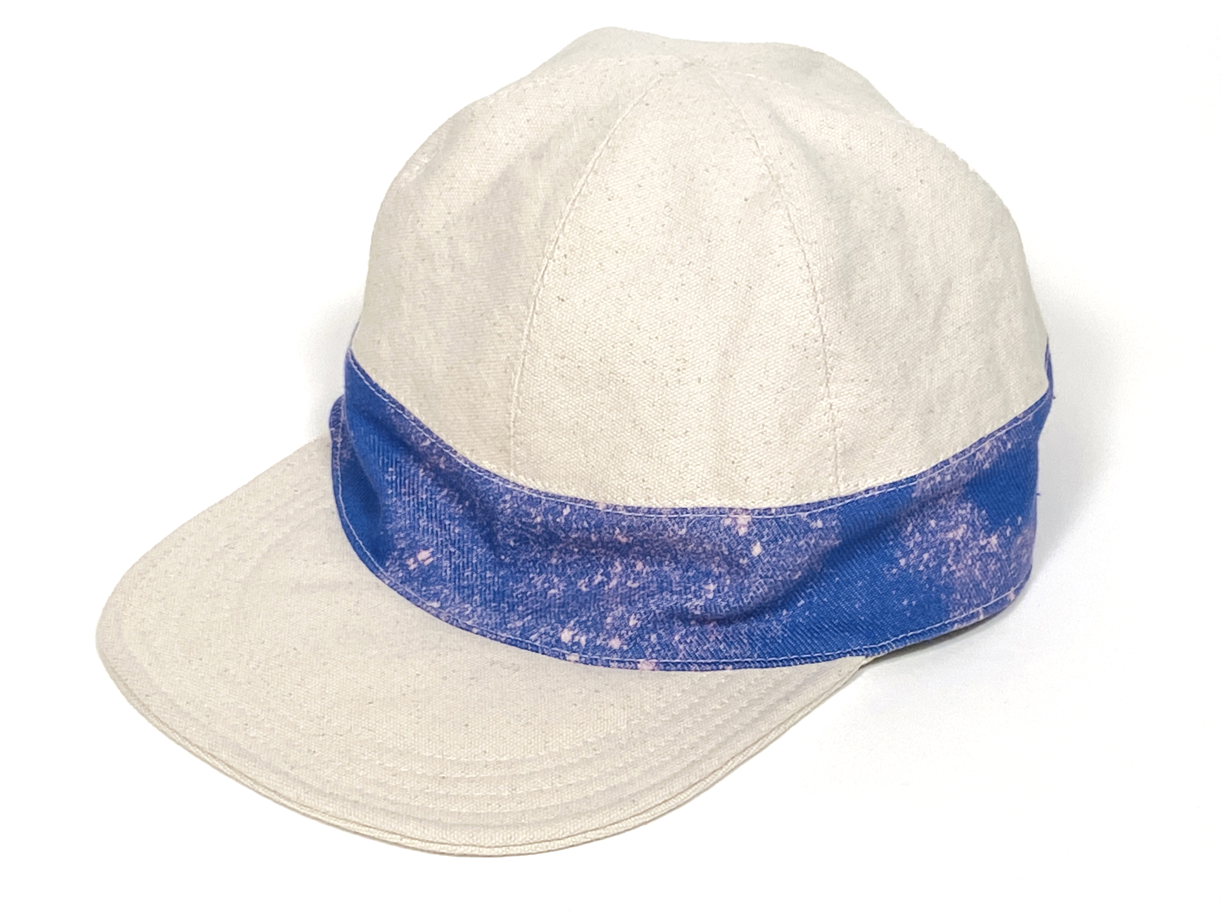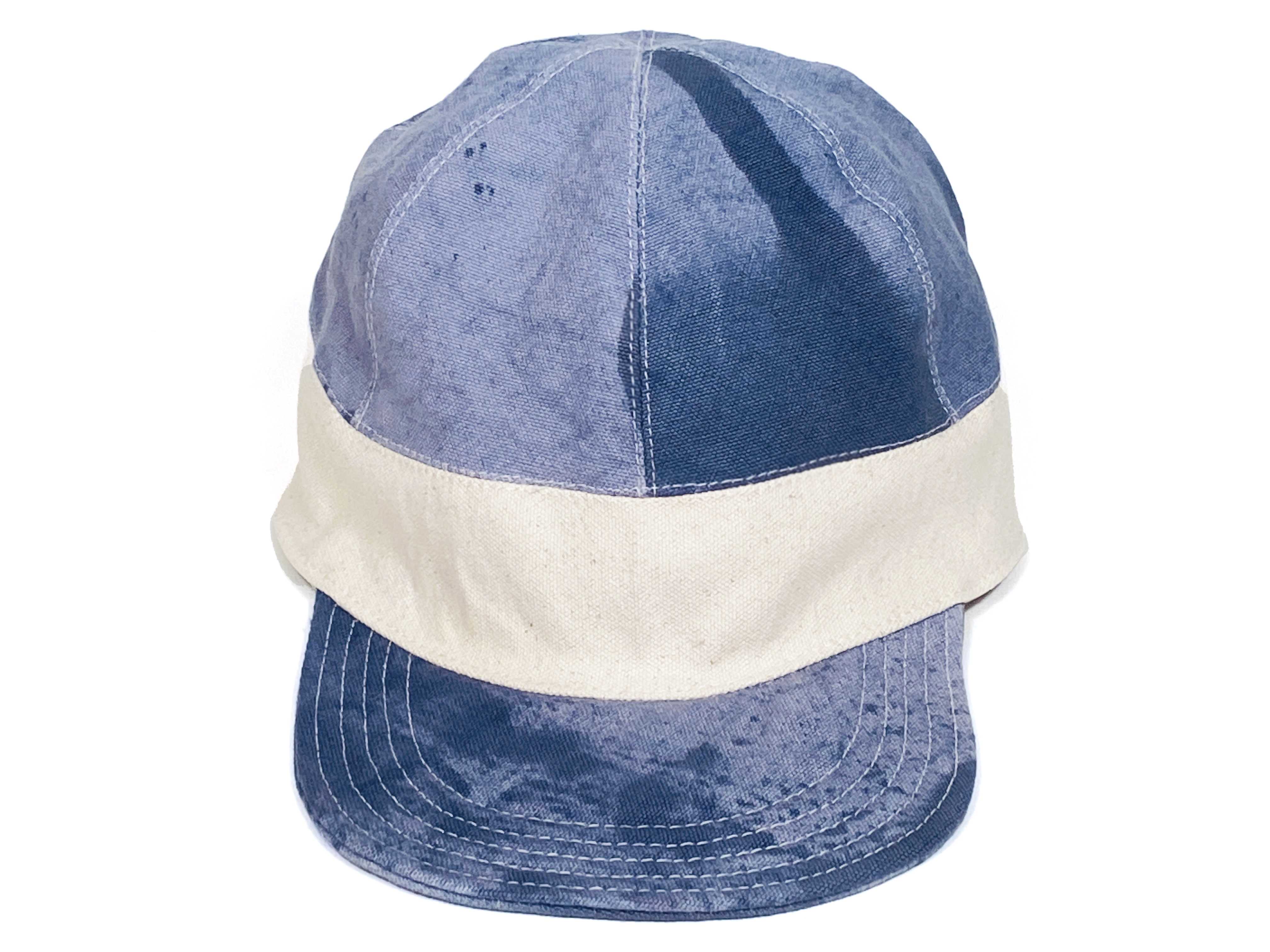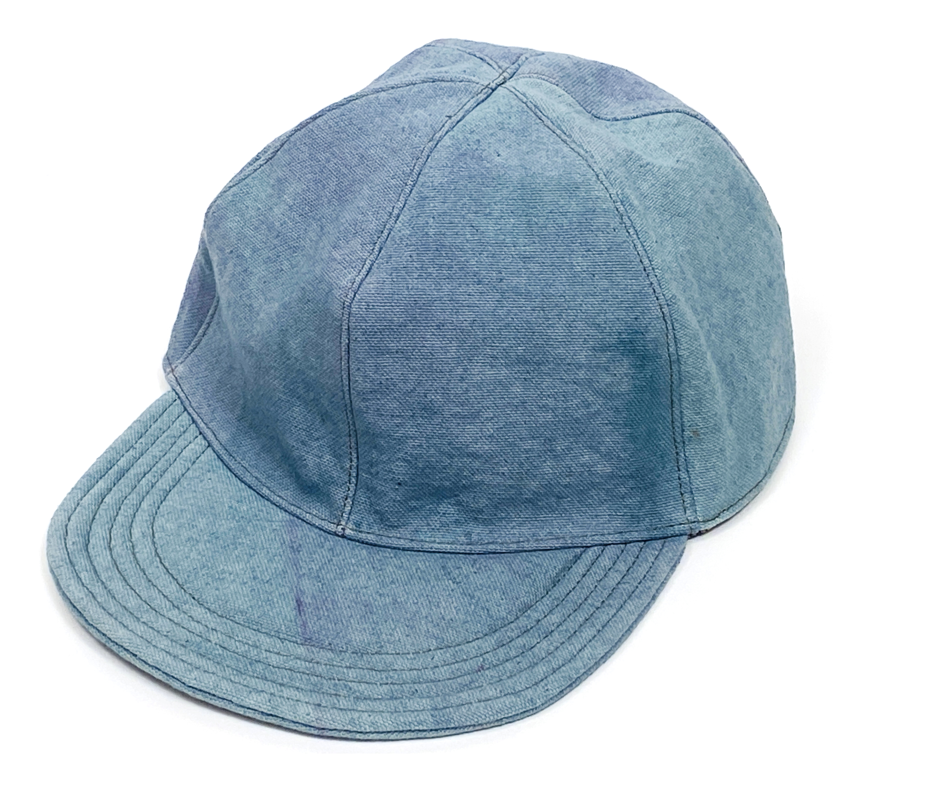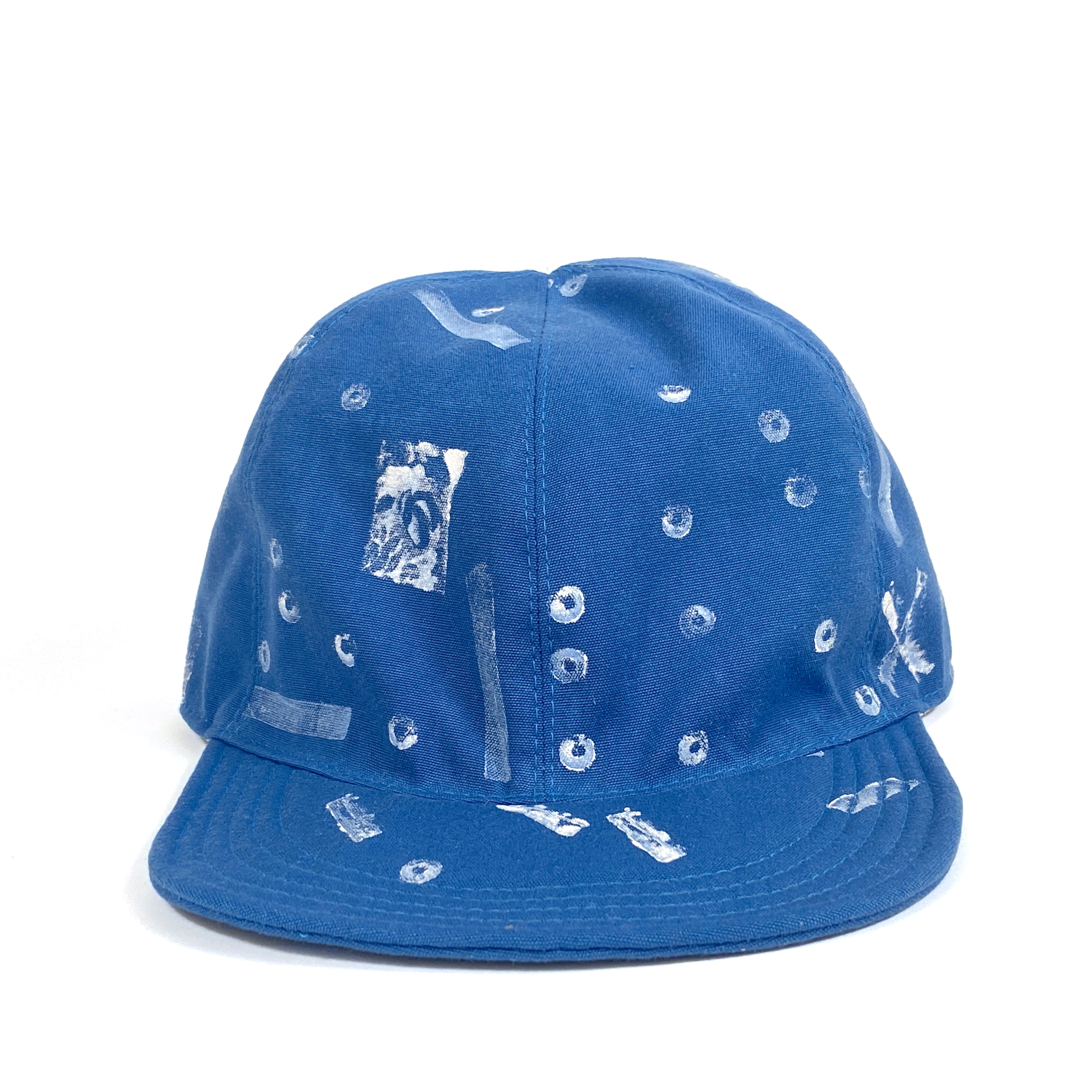 One of a kind dyed canvas crown and brim. Fully lined in thin cotton with adjustable vinyl d-ring strap. Wash cold and air dry flat.
