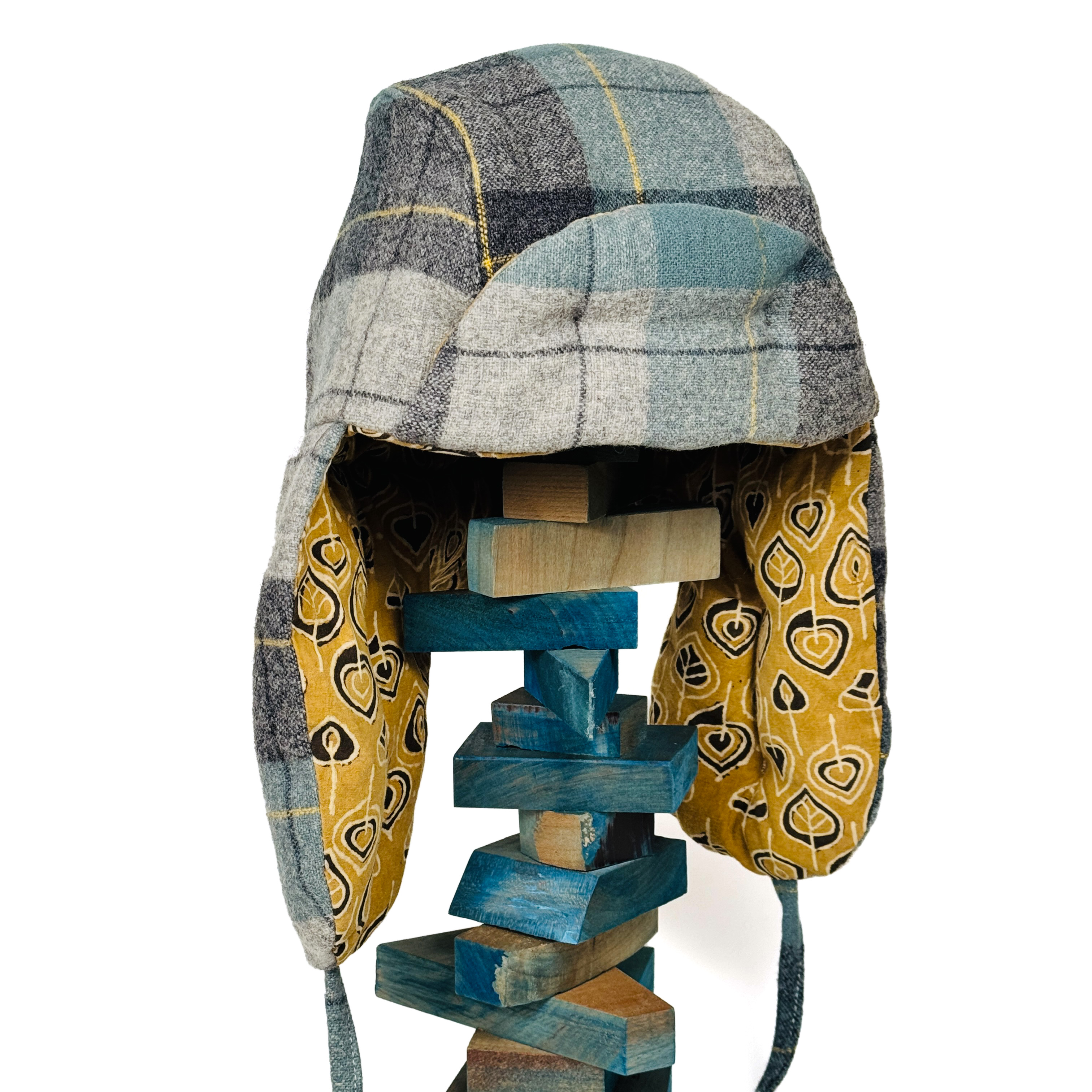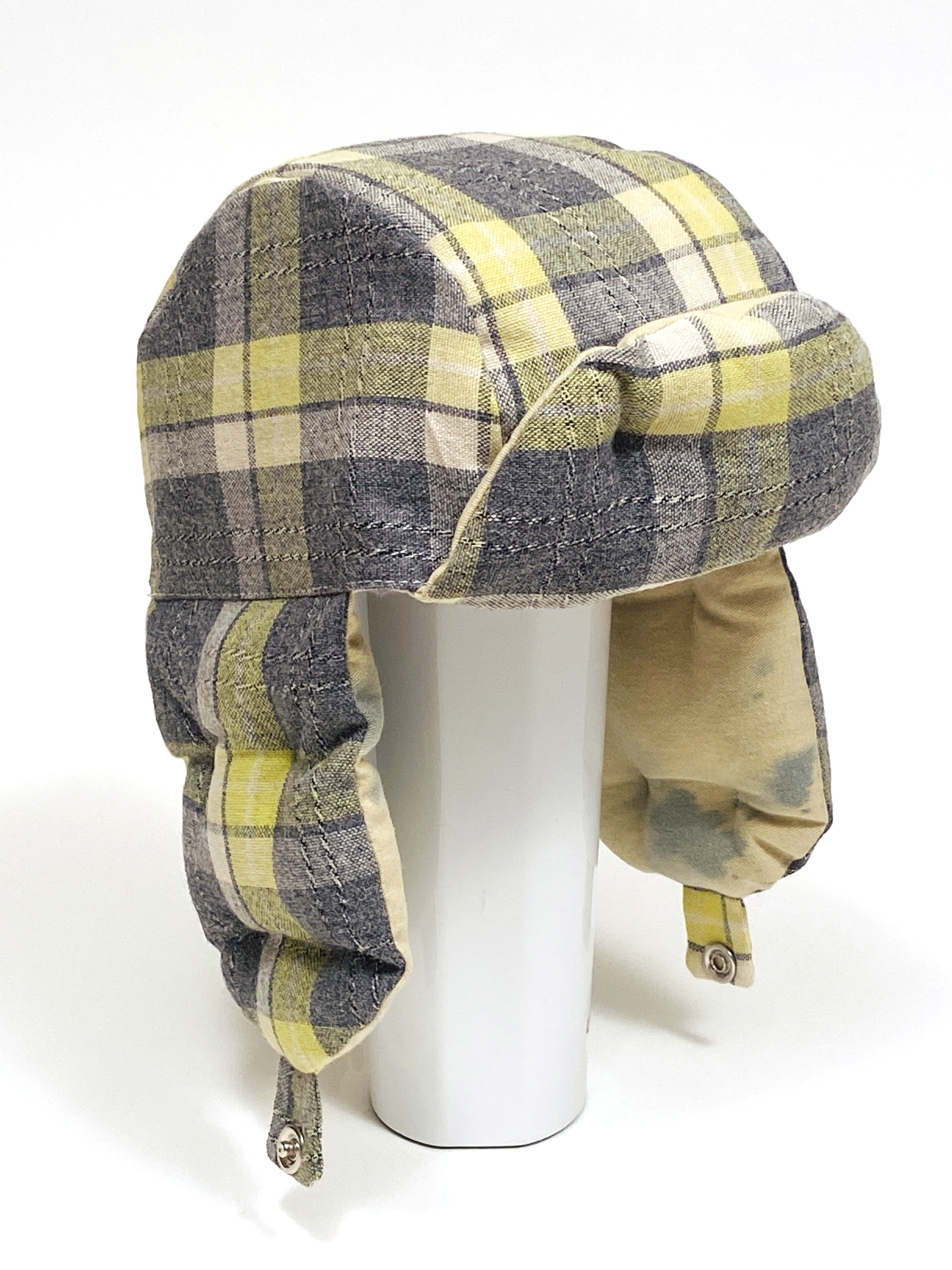 Pieced found and donated textiles with cotton batting and thin ear flap ties.