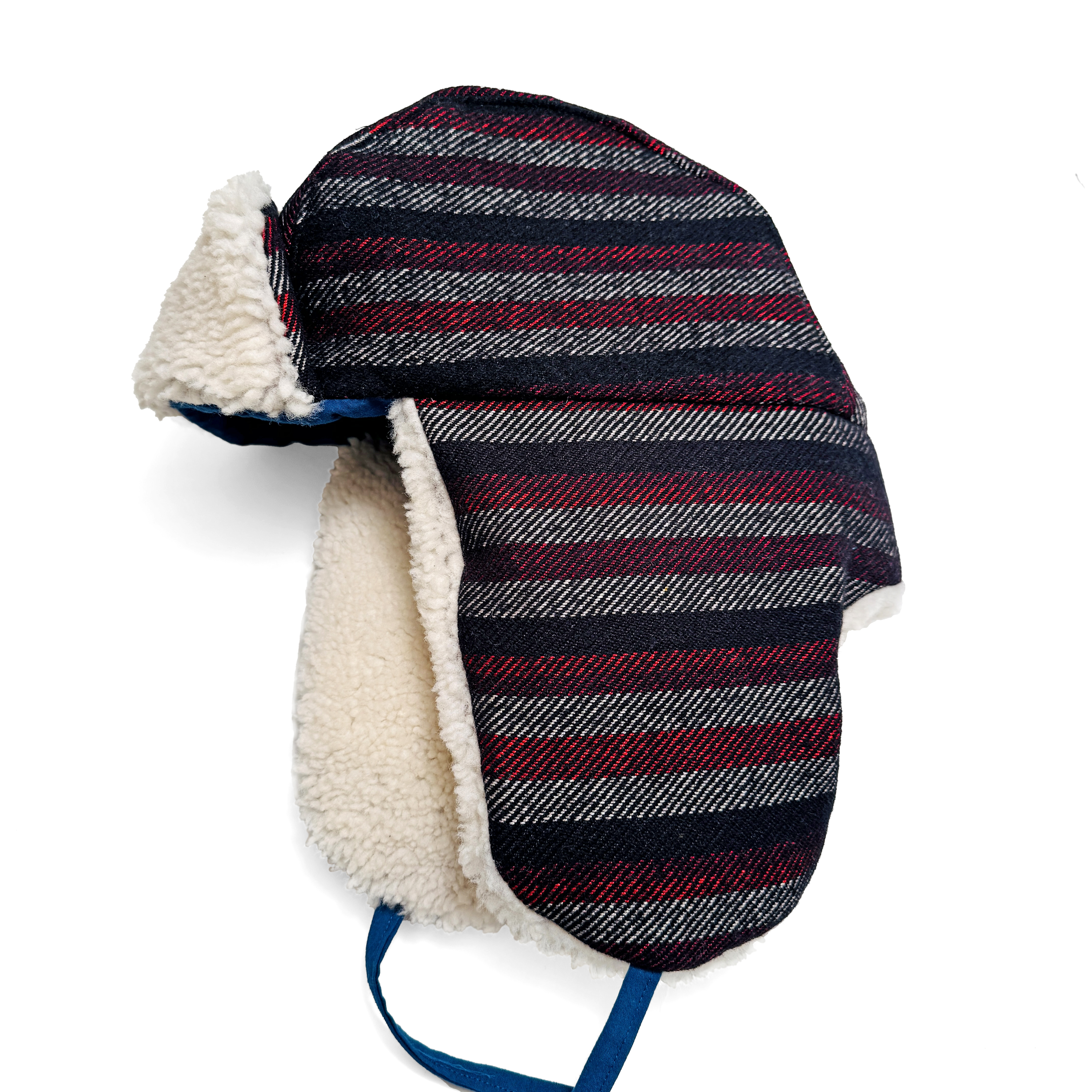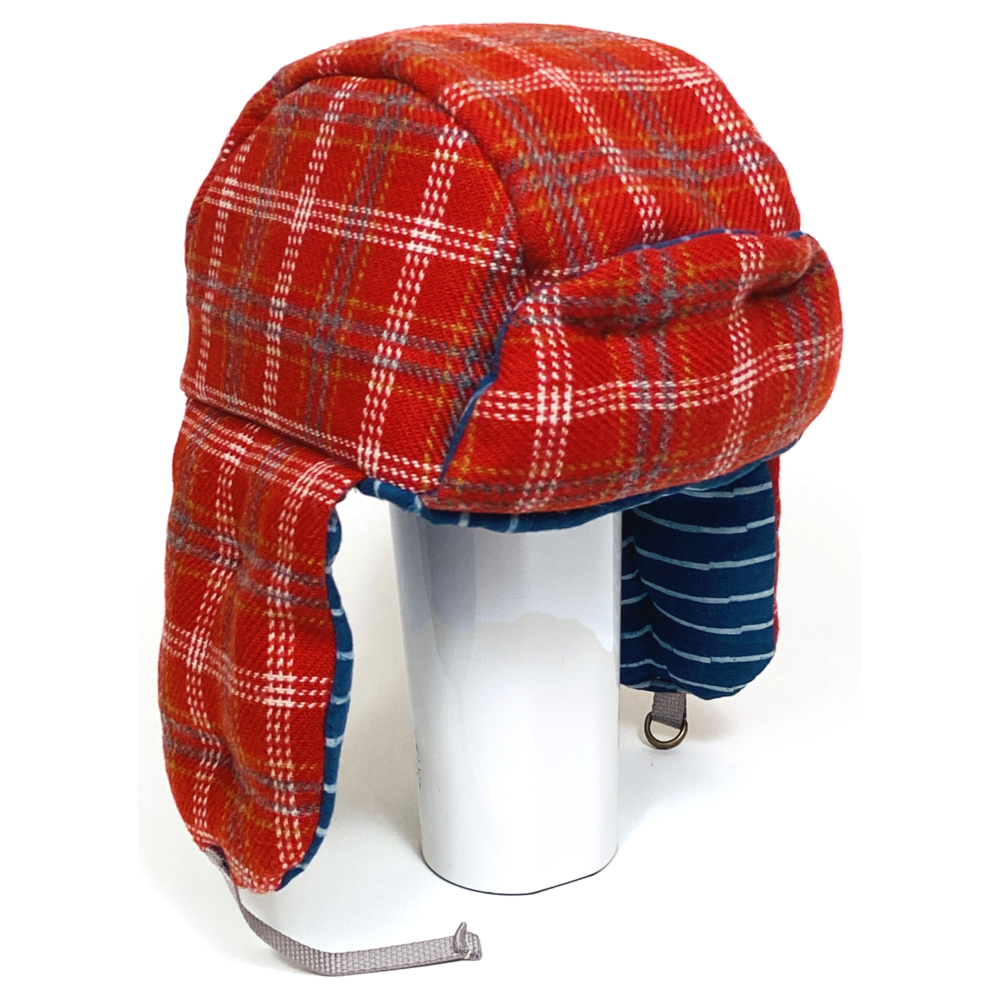 Warm woolen shell with blue stripes. Lined in grey silk and filled with 100% cotton batting. Folded down protects ears, cheeks and back of neck. Roomy fit suitable for many sizes.
