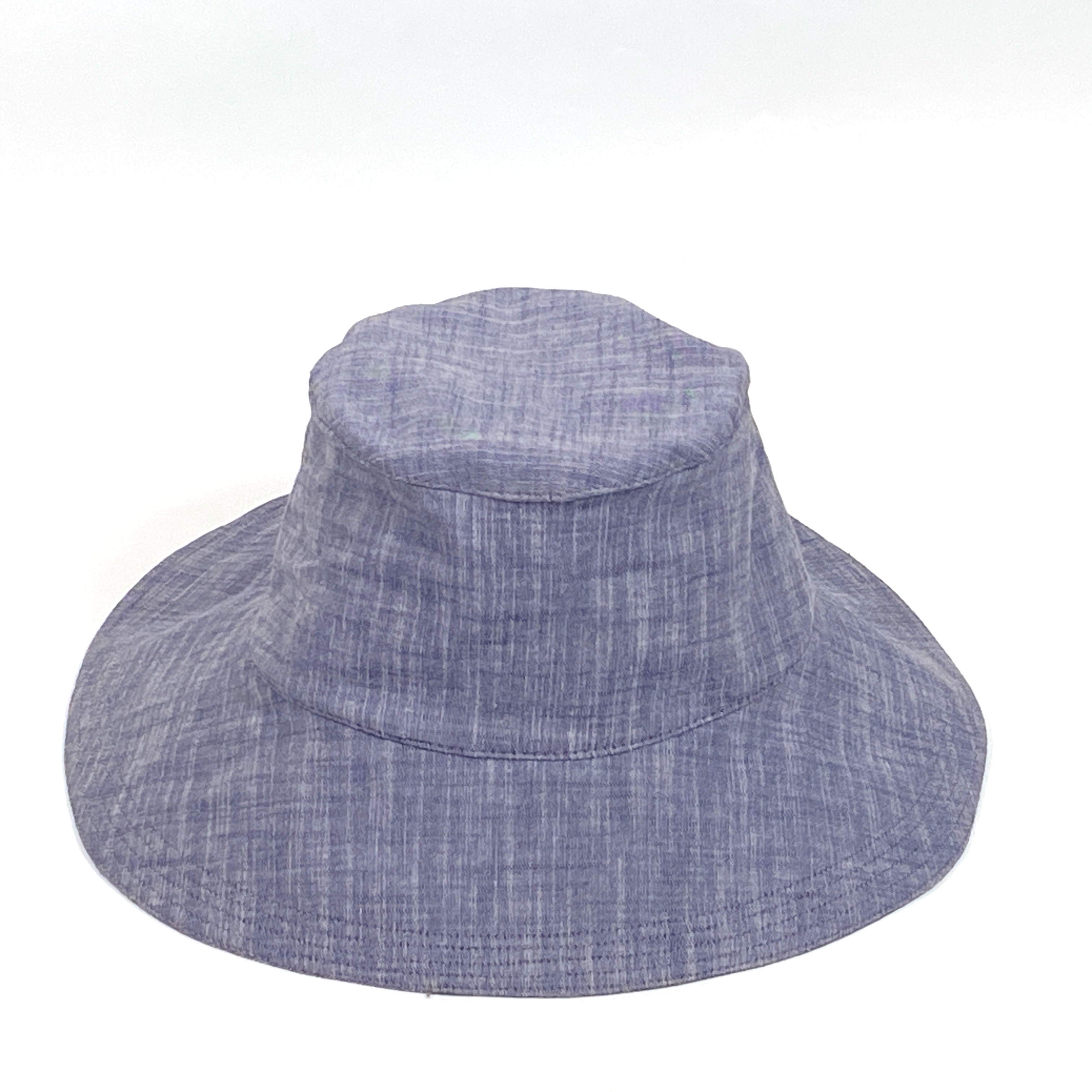 Double layered grey chambray with extra wide back brim providing excellent neck coverage. Very roomy fit - black sweat band inside and sculpting flexible brim. Wash cold and air dry.
